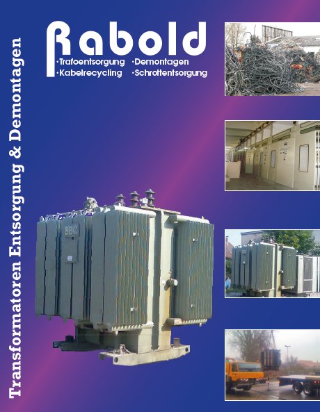 Die Firma Rabold betreibt seit den 90er Jahren Kabelrecycling, Demontagen, Tranformatorenrecycling, Metallhandel und Schrottentsorgung. Spezialisiert haben wir uns dabei auf Demontagen von Schaltanlagen und das Fachgerechte Recycling von Transformatoren bis in Größen von 100 Tonnen. Auch im Kabelrecycling und im Metallhandel haben wir uns durch spezielle Maschienen fortwährend verbessert um fachgerechte Trennung von Rohstoffen und Abfallstoffen gewährleisten zu können. Die Firma Rabold ist nach dem Bundes-Immissionsschutzgesetz zertifiziert. Der verantwortungsvolle Umgang mit begrenzten Rohstoffen und die Materialwiederverwertung gehören in das Pflichtenheft jedes vorausschauenden Unternehmens. Dieser Grundsatz bildet in der Praxis den Kern unseres umfassenden Gesamtprogramms. |